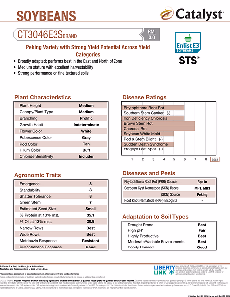 SOYBEANS CT3046e3s BRAND Peking Variety with Strong Yield Potential Across YieldCategories Broadly adapted; performs best in the East and North of Zone Medium stature with excellent harvestability Strong performance on fine textured soils VIEW DETAILED PDF View all soybean products